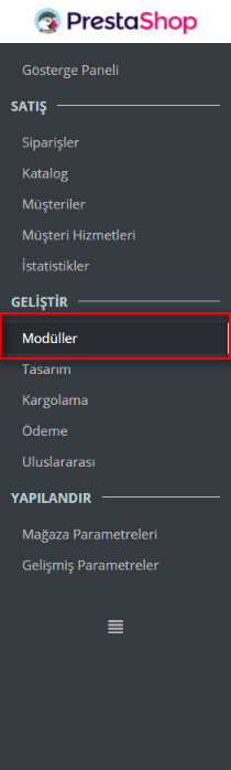 - İlk olarak Prestashop Yönetim Paneli / Geliştir sekmesin içerisinden Modüller alt sekmesine giriş yapın.